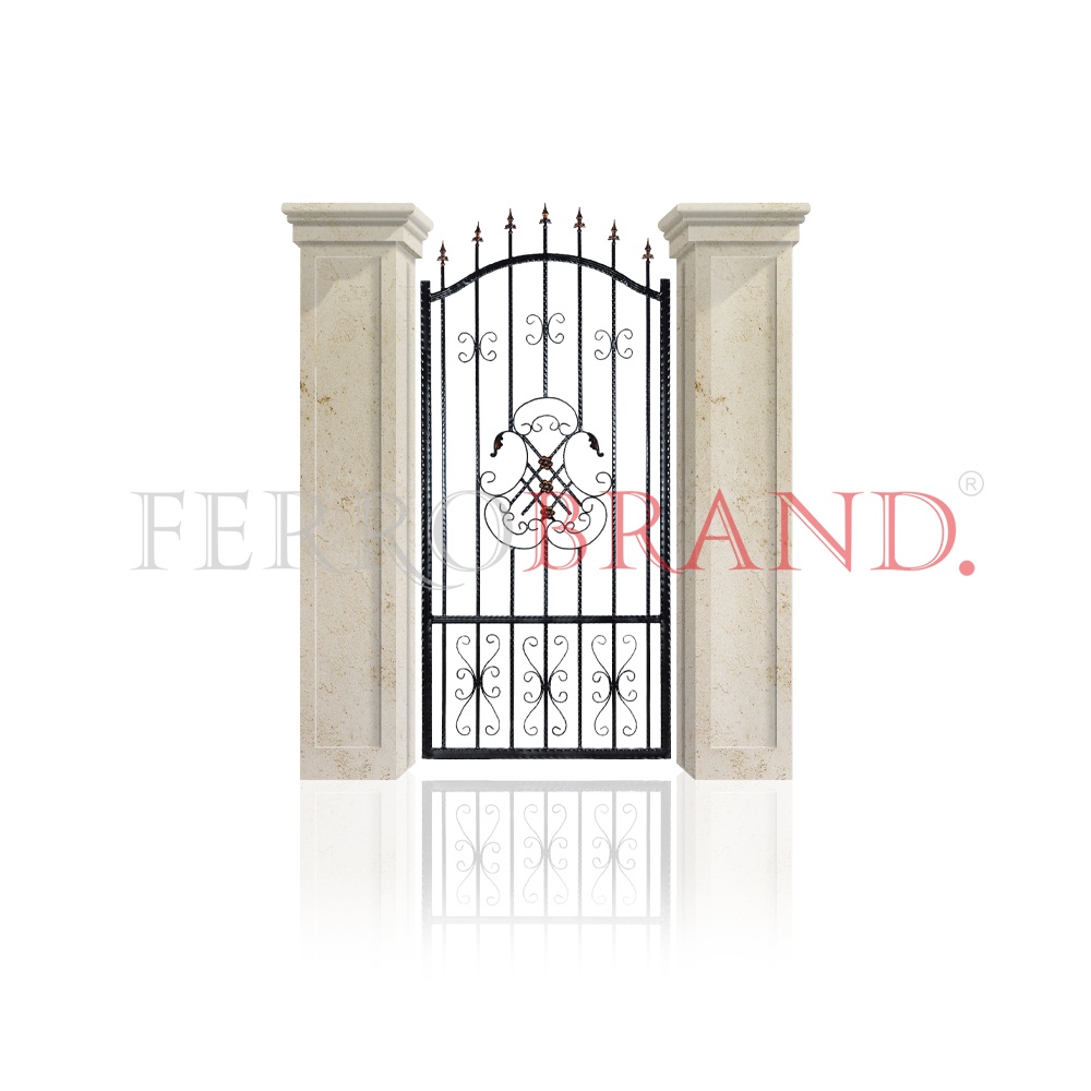 Dimensiuni poartă pietonală: 1000x2050mm | Dimensiuni poartă auto: 3000x2050mm | Culoare neagra. Grunduire si vopsire in camp electrostatic cu vopsea pulbere prin proces de polimerizare in cuptor, ceea ce asigura o calitate superioara a produsului finit, atat din punct de vedere al rezistentei mecanice, la coroziune, cat si a aspectului comercial. Patina cupru pe elementul din mijloc si varfuri. | Materiale: țeavă amprentată 15x15 mm si 40x30 mm, elemente decorative, element de mijloc, platbandă cu model dungi 30x5 mm, capace de etanșare, șilduri și vârfuri din fier forjat | Ansamblul poate fi completat cu panouri de gard din aceeași gamă și kitul de montaj (balamale, broască, butuc, mâner) | MODEL INREGISTRAT: Produsul este protejat sub marca OSIM cu numărul de înregistrare 022563