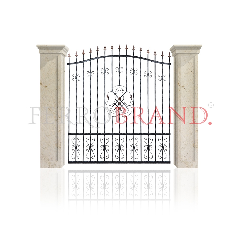 Dimensiuni: 2000 x 2050 mm | Culoare neagra. Grunduire si vopsire in camp electrostatic cu vopsea pulbere prin proces de polimerizare in cuptor, ceea ce asigura o calitate superioara a produsului finit, atat din punct de vedere al rezistentei mecanice, la coroziune, cat si a aspectului comercial. Patina cupru pe elementul din mijloc si varfuri. | Materiale: teavă amprentată 15x15 mm și 40x30 mm, elemente decorative din fier forjat, element de mijloc, platbandă cu model dungi 30x5 mm, vârfuri din fier forjat | Opțiuni suplimentare: pot fi completate cu poarta auto, poarta pietonala din aceeași gamă și kitul pentru montaj | MODEL INREGISTRAT: produs protejat sub marca OSIM cu numărul de înregistrare 022563.